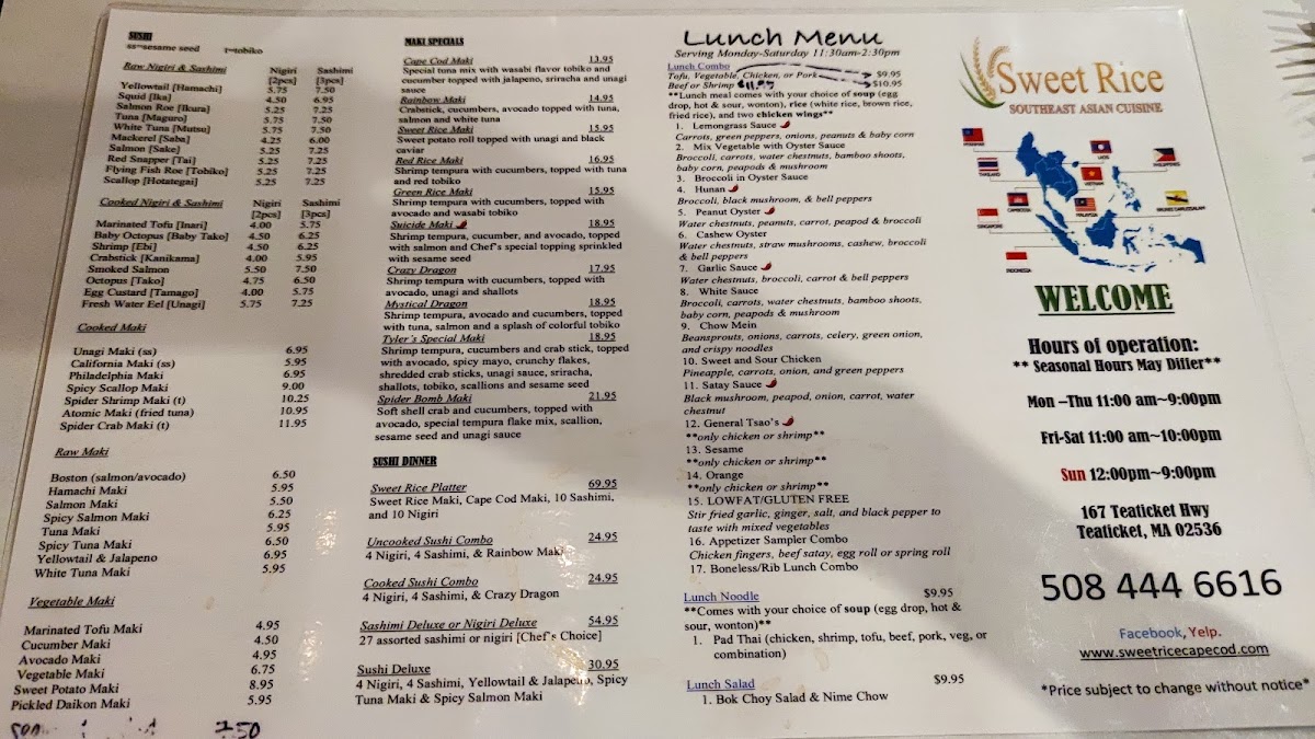 At Sweet Rice, located at 167 Teaticket Hwy East, Falmouth, MA, the menu offers a delightful blend of traditional and unique dishes, showcasing a variety of fresh ingredients and bold flavors. For those craving something light, the Bok Choy Salad, Thai Chicken Salad, and Garden Salad offer refreshing options to start your meal. The Thai Crispy Wings and Lemongrass Wings are a must-try for wing lovers, with an assortment of flavors, including the popular 1/2 Oyster Wings and 1/2 Crispy Wings. If you're in the mood for appetizers, Sweet Rice has an impressive selection, including Eggrolls, Pupu, Shrimp Rolls, and the savory Chicken Lettuce Wrap App, perfect for sharing.